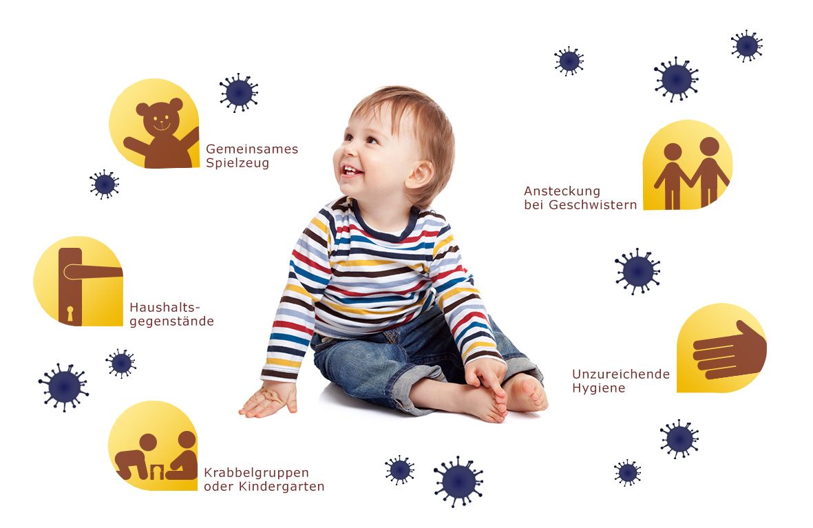 Obwohl nasskaltes Wetter keine direkte Ursache für eine Erkältung ist, begünstigt es das Risiko eines Infekts, da das Immunsystem des Kindes geschwächt wird. In den Herbst- und Wintermonaten kommen Erkältungen bei Kindern daher sehr häufig vor. Ebenso wie Erwachsene stecken sich Kinder vor allem über die sogenannte „Tröpfcheninfektion“ mit Erkältungsviren an. Die Übertragung der Viren geschieht häufig durch Kontakt mit anderen Kindern (z. B. in Krabbelgruppen/ im Kindergarten oder zuhause bei den eigenen Geschwistern), beim Spielen mit gemeinsamem Spielzeug, durch nicht entsorgte Taschentücher oder ungewaschene Hände. Die Viren verteilen sich in der Luft und werden von dem Kind eingeatmet oder sie gelangen durch die Haut in den Körper.